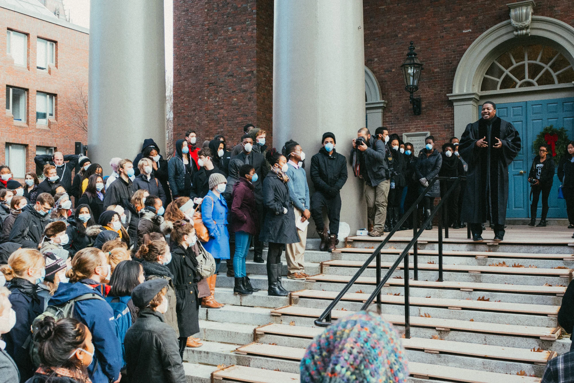 Dozens of people gathered at the Harvard Memorial Church Sunday wearing paper masks reading "I can't breathe" to staged a die-in. Harvard Divinity Professor Jonathan L. Walton spoke briefly to the assembled crowd. The Harvard Crimson has a good write up of the event.